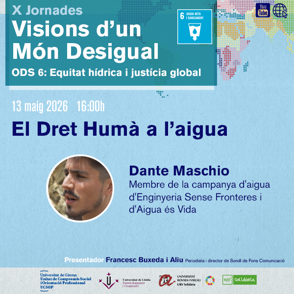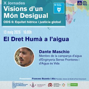 El Dret Humà a l'aigua serà la segona de les X Jornades Visions d'un Món Desigual 2025-26, a càrrec de Dante Maschio, membre de la campanya d'aigua d'Enginyeria Sense Fronteres i d'Aigua és Vida.