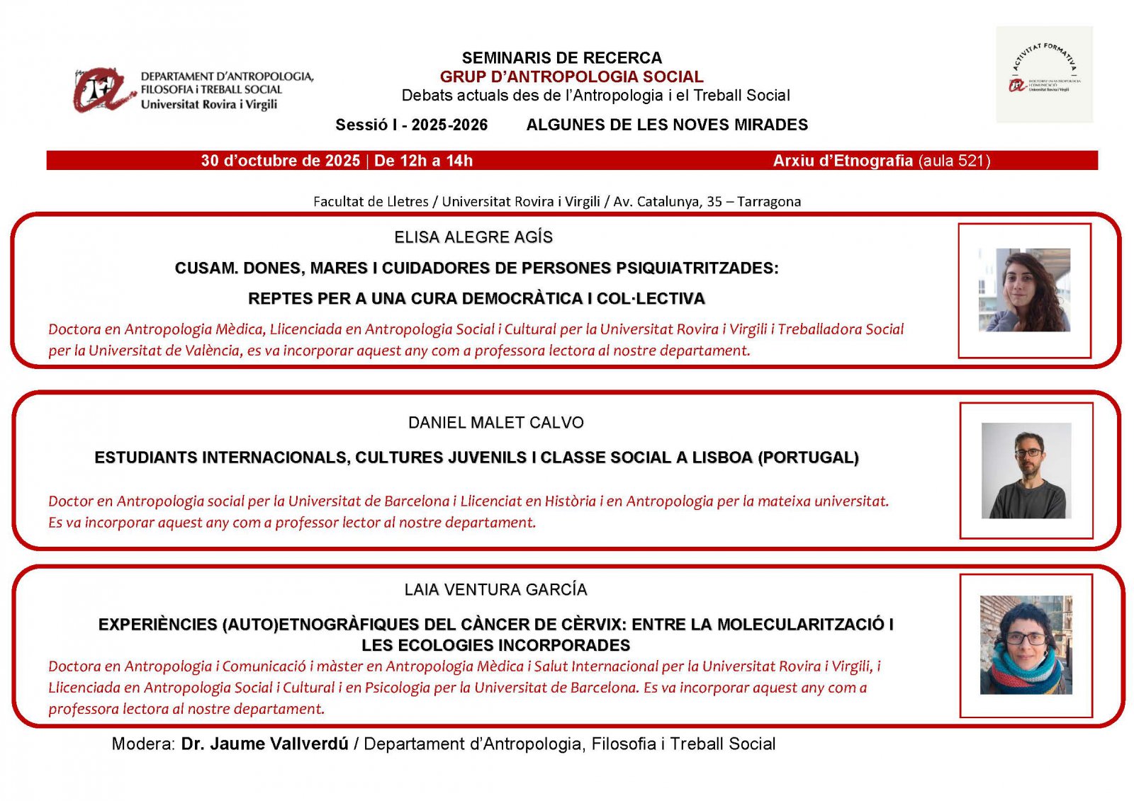 Com cada any, el Grup d'Antropologia Social ofereix a tot el públic interessat les sessions del Seminari de Recerca: Debats actuals des de l'Antropologia i el Treball Social.