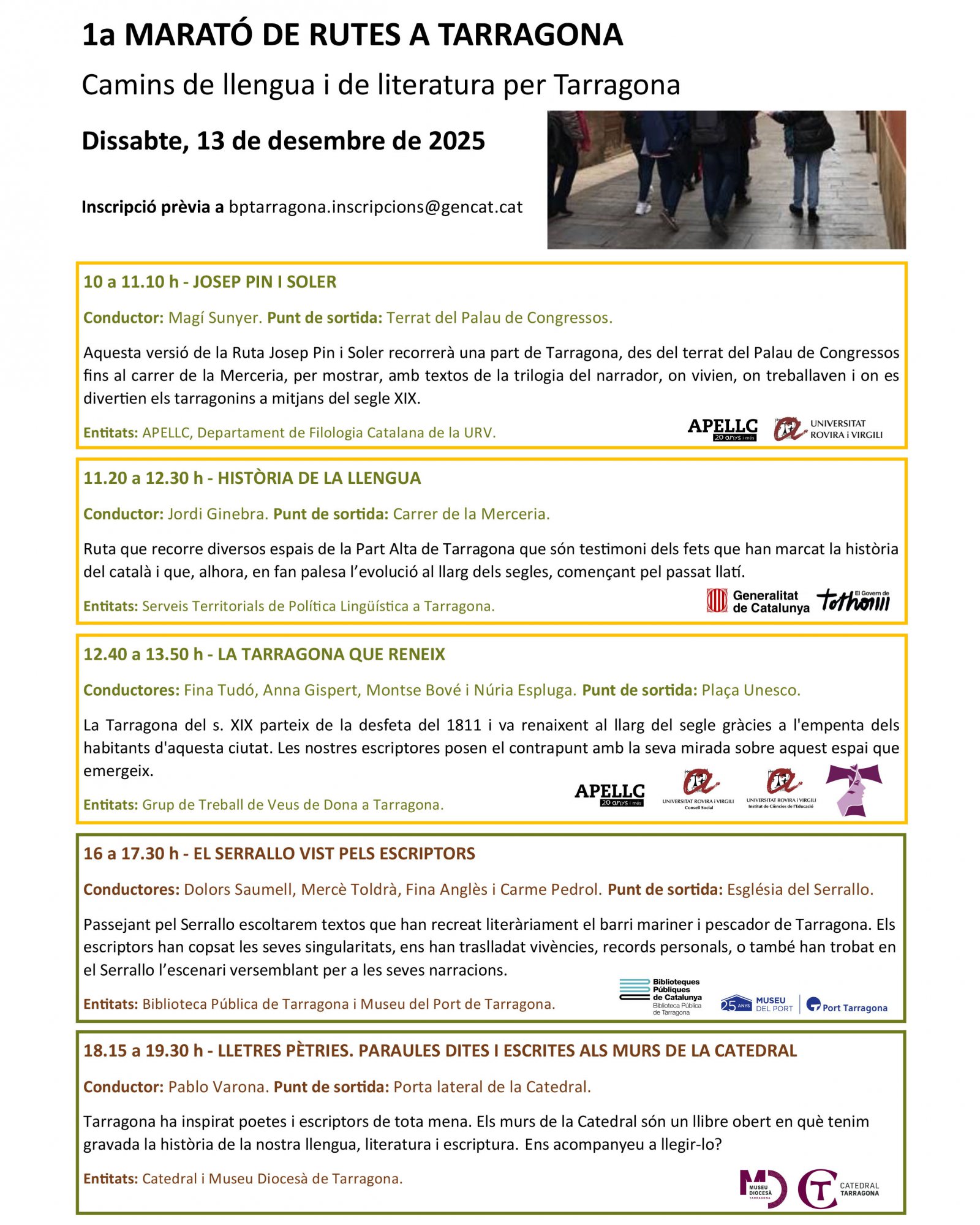Jornada dedicada a gaudir de la llengua i la literatura amb la proposta de cinc rutes que s'iniciaran amb Josep Pin i Soler i que continuaran amb la història de la llengua i amb la descoberta de Tarragona amb veu de dona. A la tarda es descobriran mirades literàries al barri marítim del Serrallo i es finalitzarà amb una proposta literària a la Catedral.