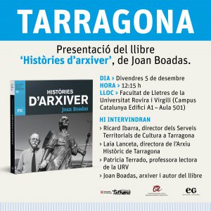 El Departament de Cultura de la Generalitat de Catalunya, la URV i Editorial Gavarres organitzen la presentació del llibre Històries d’arxiver, de Joan Boadas. Hi intervindran, a més de l’autor, Patricia Terrado, professora lectora de la URV; Ricard Ibarra, director dels Serveis Territorials de Cultura a Tarragona, i Laia Lanceta, directora de l’Arxiu Històric de Tarragona.