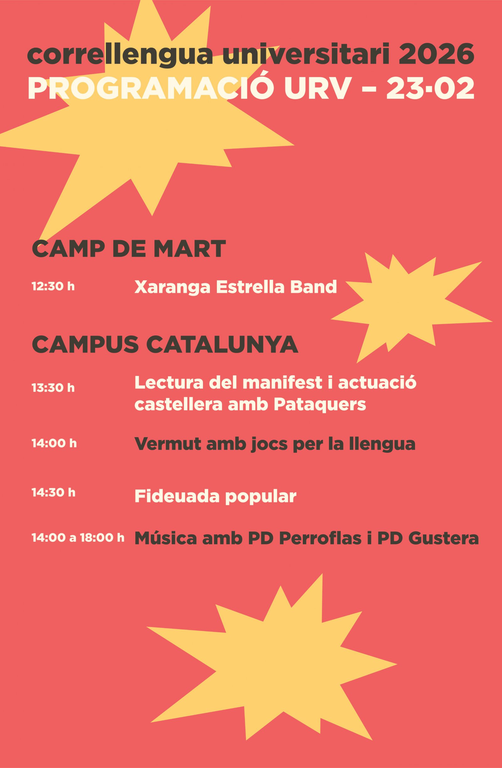 Arribada de la flama del Correllengua Universitari a la URV. La flama arriba a les 12.30 al Camp de Mart i, amb acompanyament de la Xaranga Estrella Band, es dirigirà en comitiva fins al campus Catalunya, on hi haurà, a partir de les 13.30 h, lectura de manifest, actuació dels Pataquers, vermut amb jocs lingüístics, dinar popular i música catalana amb els PD Perroflas i Gustera, fins a les 18.00 h.