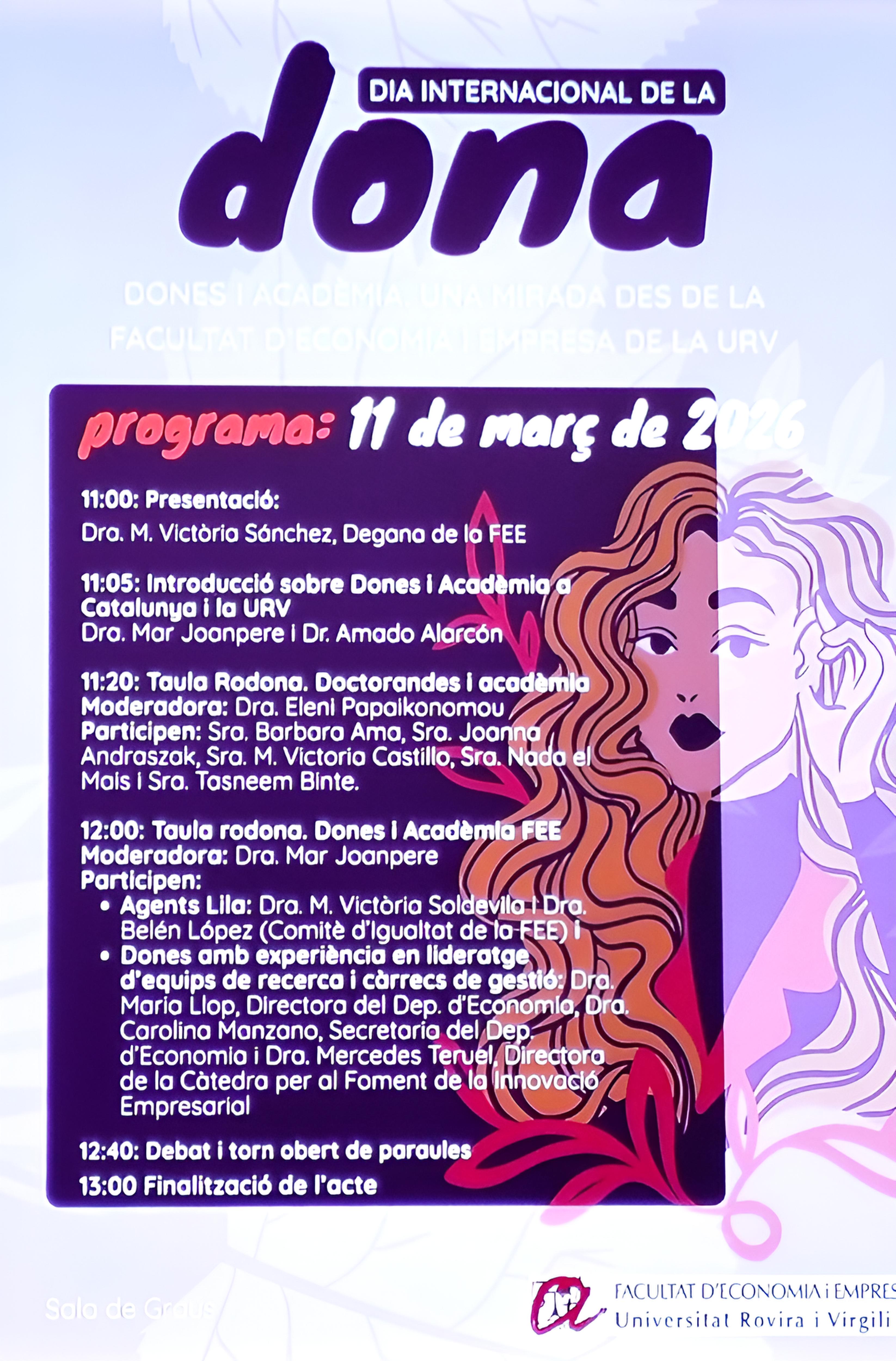 Participada per Agents Lila (Maria Victòria Soldevila i Belén Álvarez, Comitè d'Igualtat de la FEE) i professores amb experiència en lideratge de equips de recerca, de projectes/equips d'investigació i/o càrrecs de gestió (Maria Llop, Directora del Departament d'Economia, Carolina Manzano, Secretaria del Departament d'Economia i Mercedes Teruel (Directora de la Catedra de Foment de la Innovació Empresarial. Compartiran l'oportunitat de contrastar la seva experiència en relació a les intervencions prèvies.