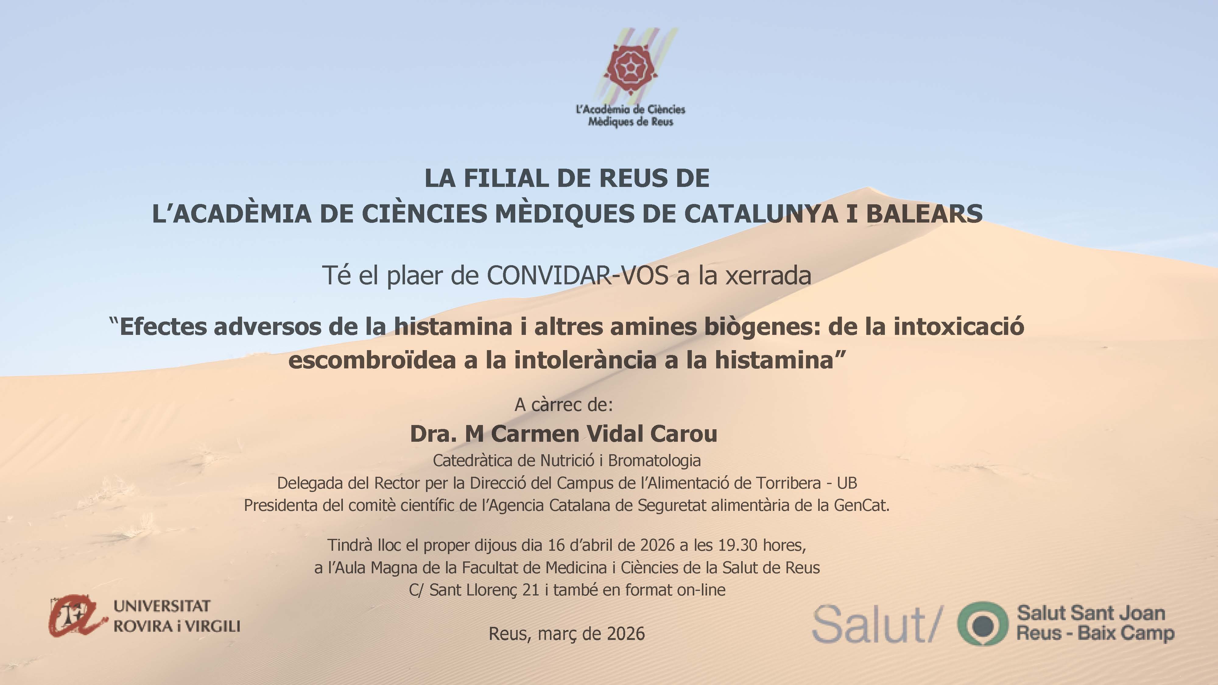 Xerrada sobre "Efectes adversos de la histamina dels aliments: de la intoxicació escombroidea a la intolerància a la histamina" a càrrec de la M Carmen Vidal Carou, organitzada per la filial de Reus de l'Acadèmia de Ciències Mèdiques de Catalunya i Balears.