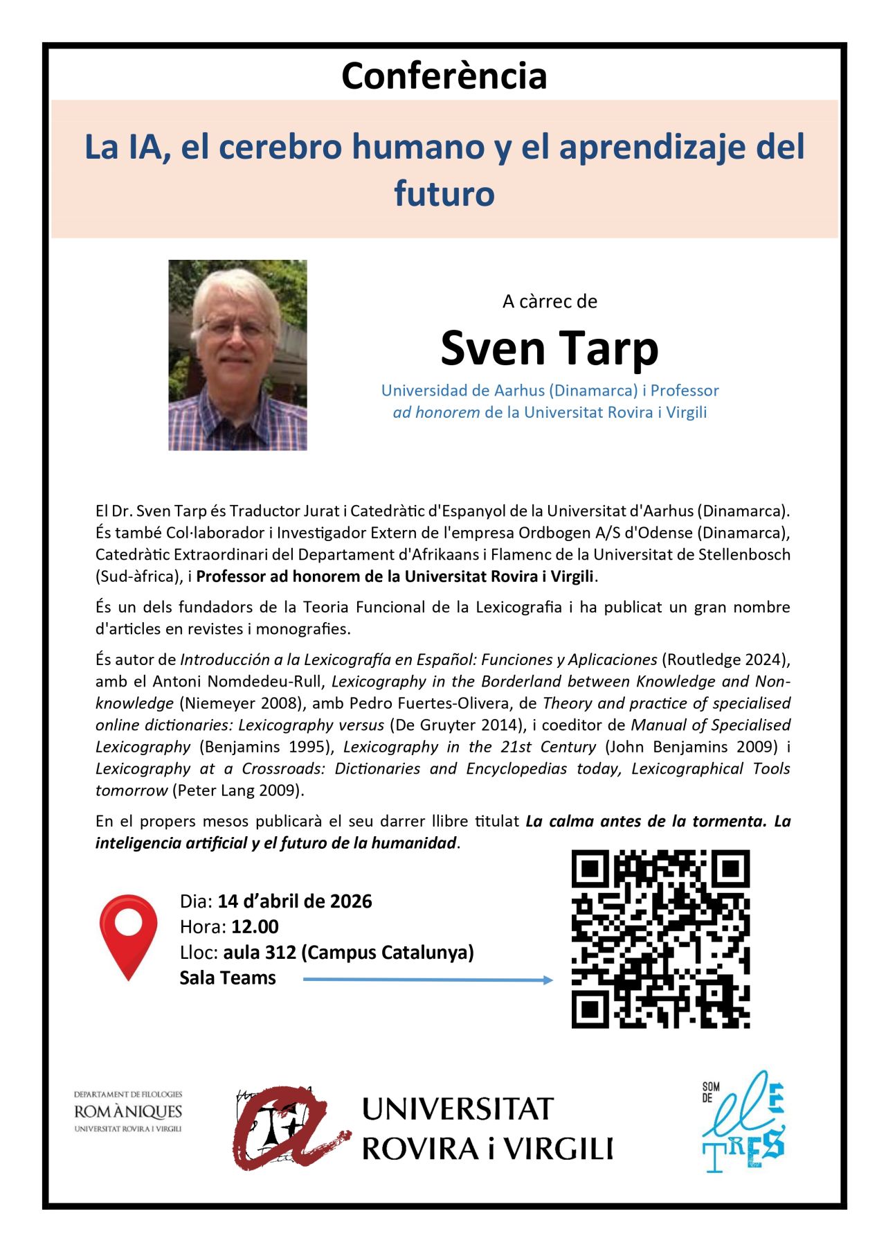 Sven Tarp, traductor jurat i catedràtic d’espanyol de la Universitat d’Aarhus i professor ad honorem de la URV, imparteix la conferència "La IA, el cervell humà i l’aprenentatge del futur", de manera presencial i en línia en aquest enllaç.