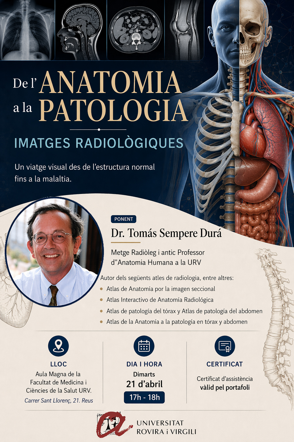 Conferència "De l'Anatomia a la Patologia. Imatges radiològiques" a cargo del Dr. Tomás Sempere Durá, profesional de reconocido prestigio como médico radiólogo y como docente, autor de excelentes atlas, muy didácticos, de anatomía y patología radiológica.